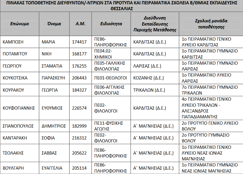 Με απόφαση της αν. Περιφερειακής Διευθύντριας Πρωτοβάθμιας και Δευτεροβάθμιας Εκπαίδευσης Θεσσαλίας κας Βασιλικής Ζιάκα τοποθετούνται οι κάτωθι εκπαιδευτικοί Δευτεροβάθμιας Εκπαίδευσης στις αντίστοιχες κενές θέσεις Διευθυντών/-ντριών των Πρότυπων Σχολείων (Π.Σ.) και Πειραματικών Σχολείων (ΠΕΙ.Σ.) της ΠΔΕ Θεσσαλίας, σύμφωνα με άρθρο 14 της με αριθμό 149720/Δ6/03-12-2022 Υ.Α. και θέμα «Ρύθμιση θεμάτων σχετικών με τη διαδικασία επιλογής και τοποθέτησης των Διευθυντών Πρότυπων και Πειραματικών Σχολείων» (Β ́6142), ως εξής: