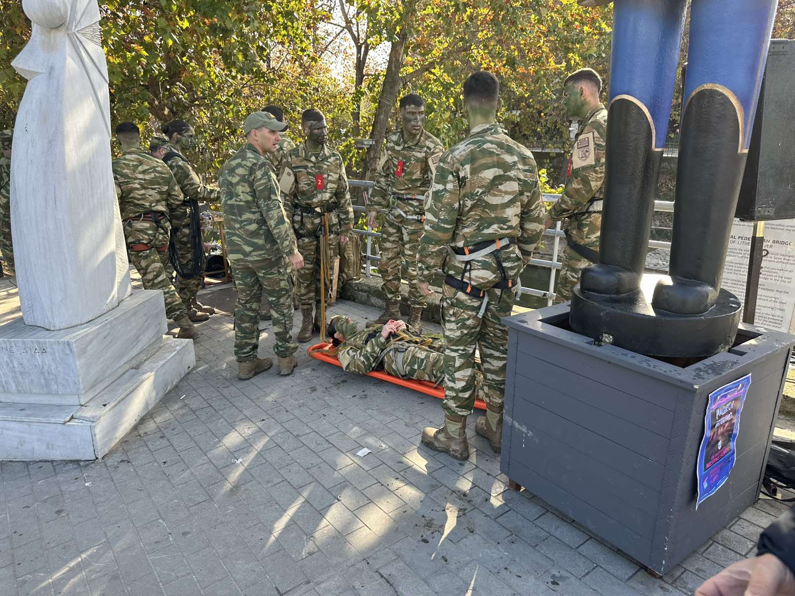 Παρουσία μαθητών Λυκείων της πόλης αλλά και πλήθους πολιτών και επισκεπτών που συγκεντρώθηκαν κατά μήκος της όχθης, οι μελλοντικοί υπαξιωματικοί πραγματοποίησαν διέλευση του ποταμού, κίνηση σε εναέρια γραμμή και άσκηση διάσωσης τραυματία.