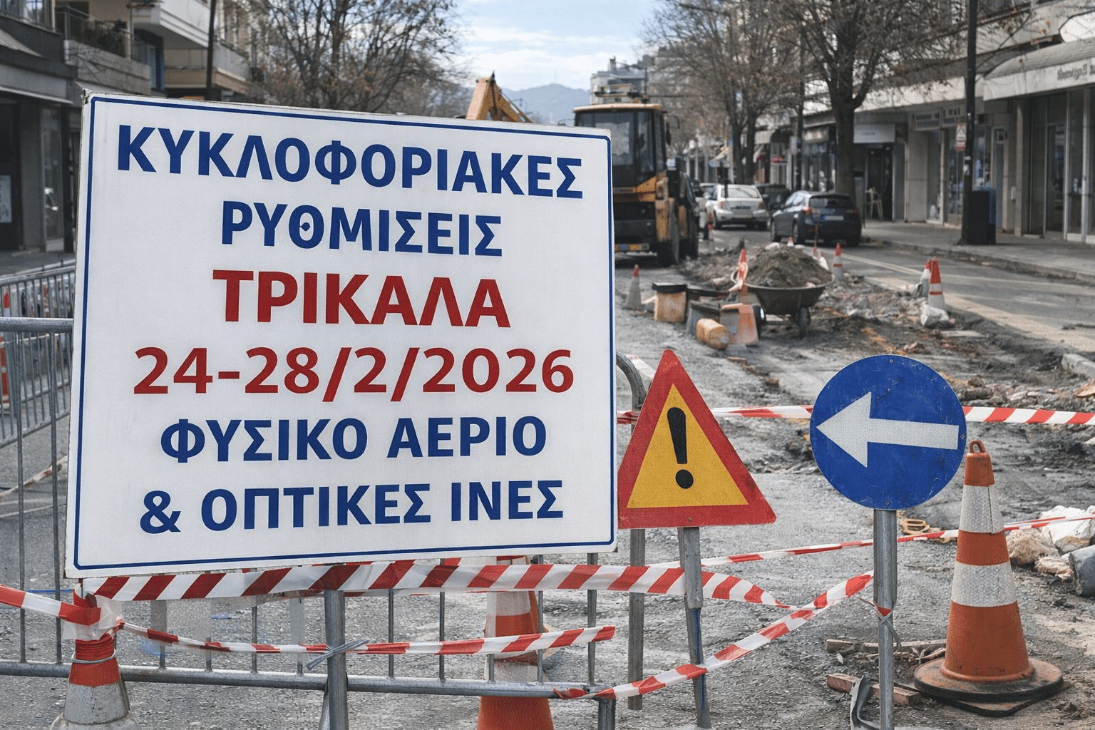 Προσωρινές κυκλοφοριακές ρυθμίσεις τίθενται σε ισχύ στην πόλη των Τρικάλων από την Τρίτη 24/02/2026 έως και το Σάββατο 28/02/2026, λόγω εργασιών σε δίκτυο φυσικού αερίου, τοποθέτηση/εγκατάσταση οπτικών ινών και οικοδομικές εργασίες, με διακοπές κυκλοφορίας και στενώσεις οδοστρώματος σε συγκεκριμένα τμήματα οδών.