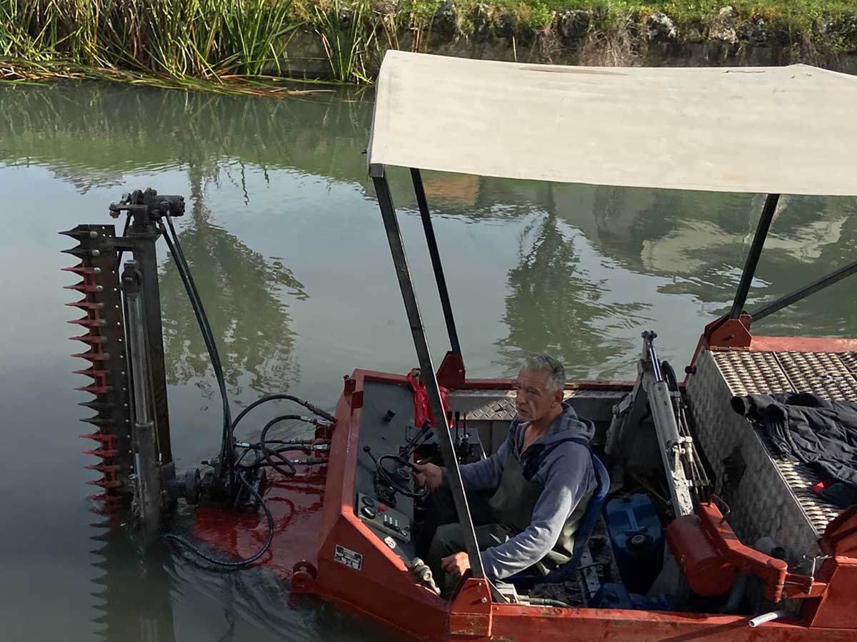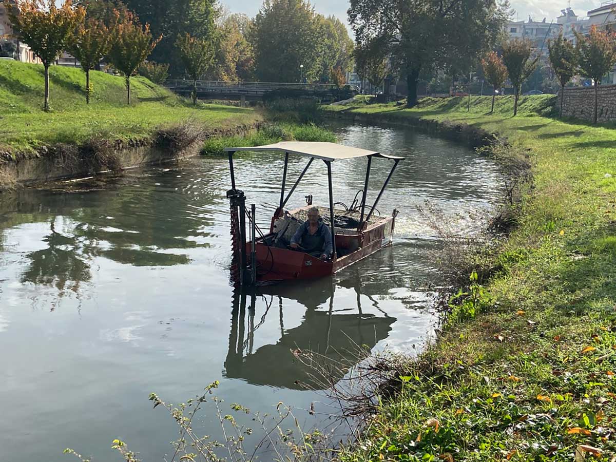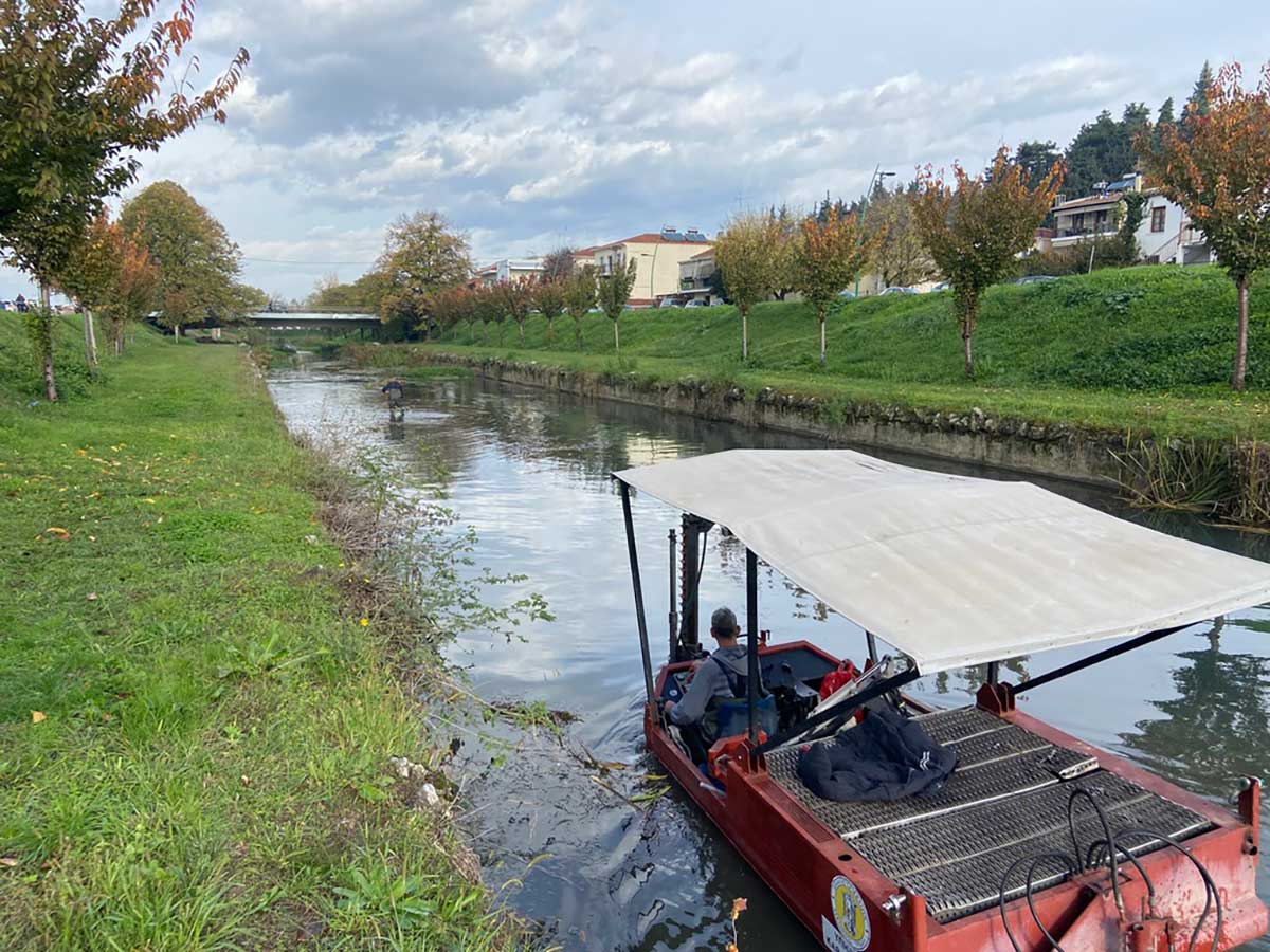 Το ειδικό πλωτό μηχάνημα–βάρκα του Δήμου, κατασκευασμένο για καθαρισμούς ποταμών, κόβει και απομακρύνει τη βλάστηση όπου το βάθος το επιτρέπει.