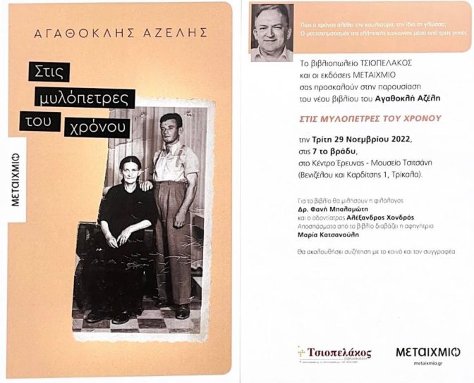 Το βιβλιοπωλείο Τσιοπελάκος και οι εκδόσεις Μεταίχμιο σας προσκαλούν στην παρουσίαση του νέου βιβλίου του Αγαθοκλή Αζέλη «Στις Μυλόπετρες του χρόνου».