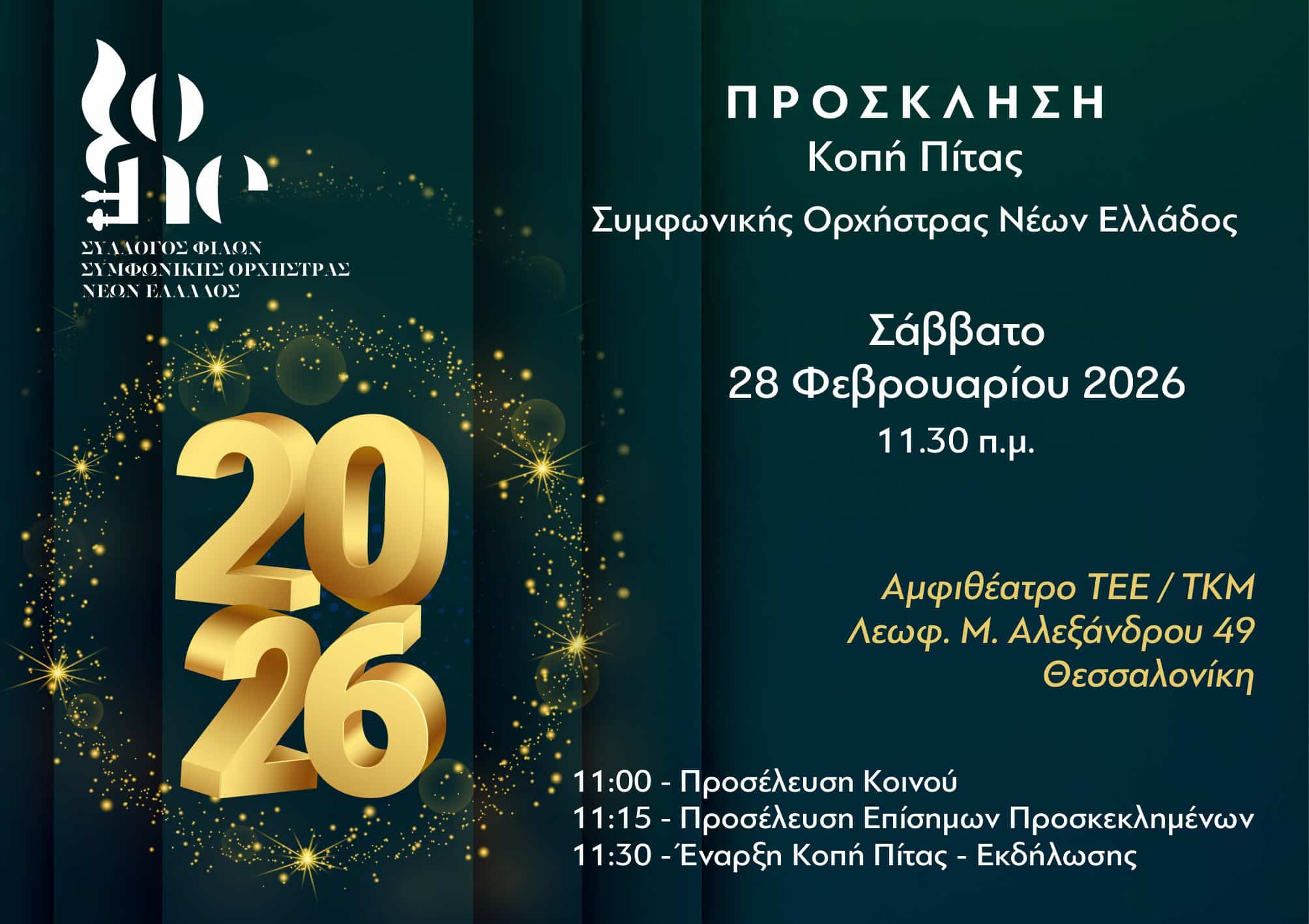 Την καθιερωμένη εκδήλωση κοπής της πρωτοχρονιάτικης πίτας της διοργανώνει η Συμφωνική Ορχήστρα Νέων Ελλάδος (ΣΟΝΕ), το Σάββατο 28 Φεβρουαρίου 2026 και ώρα 11:30 το πρωί, στη Θεσσαλονίκη.