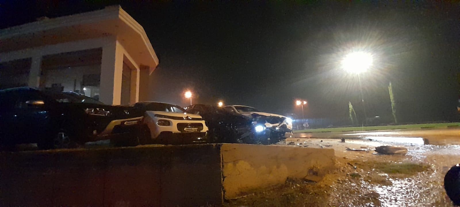 Από τη σφοδρή σύγκρουση προκλήθηκαν εκτεταμένες ζημιές σε τουλάχιστον τρία οχήματα της έκθεσης. Στο σημείο έσπευσαν αστυνομία και ΕΚΑΒ.